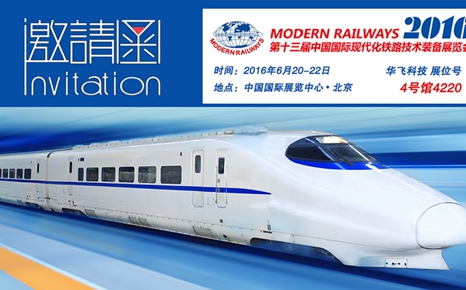 2016-06-13華飛科技邀您參加“2016鐵路技術裝備展”第十三屆中國國際現代化鐵路技術裝備展覽會(MODERN RAILWAYS 2016)于2016年6月20-22日在北京?中國國際展覽中心舉辦。本屆展會旨在展示中國鐵路近...查看更多 -